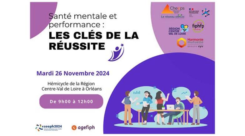 L'Agefiph, CHEOPS, le FIPHFP, France Travail, Harmonie Mutuelle, et la Région Centre-Val de Loire s’associent pour organiser l’événement "Santé mentale et performance" qui se tiendra le 26 novembre 2024, de 9h à 12h, dans l'hémicycle de la Région Centre, à Orléans.